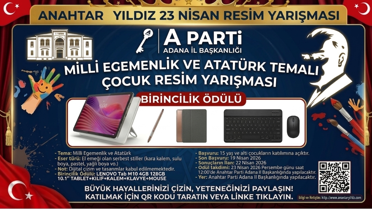 Anahtar Parti Adana İl Başkanlığı olarak, 23 Nisan Ulusal Egemenlik ve Çocuk Bayramı coşkusunu sanatla taçlandırıyoruz. "Milli Egemenlik ve Atatürk" temalı resim yarışmamızda geleceğin yıldızı çocuk yetenekleri arıyoruz.. Hayal gücüne inanıyorsan